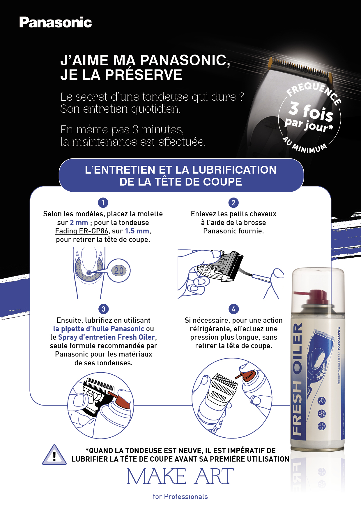 Pour l’entretien des tondeuses Panasonic, il est recommandé d’utiliser le spray nettoyant et lubrifiant de Panasonic : Fresh Oiler.
