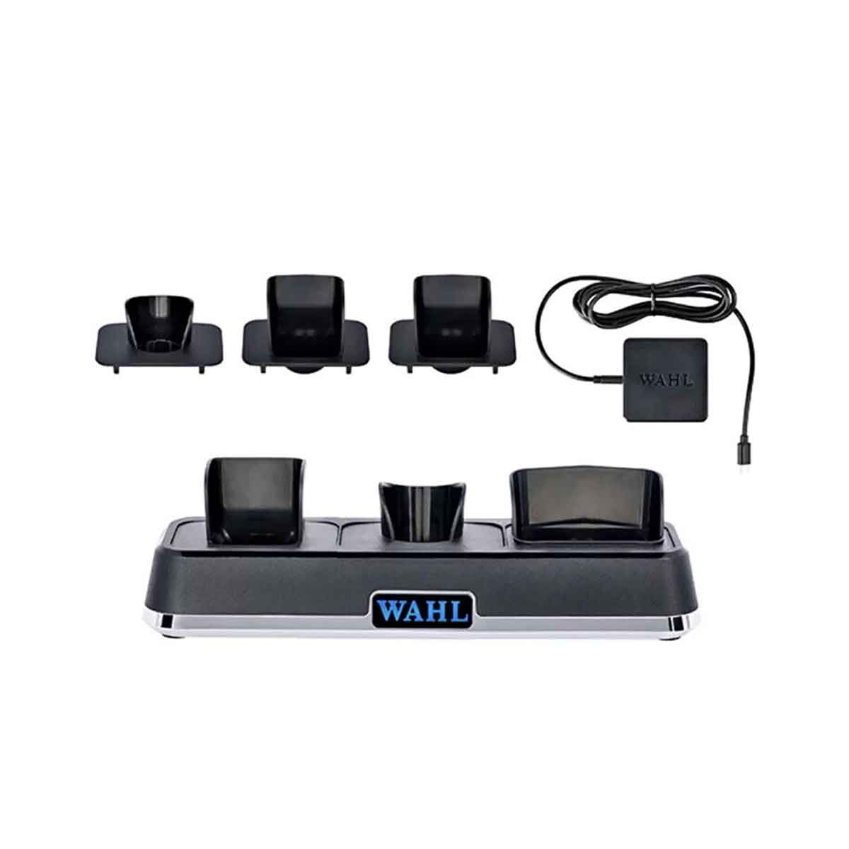 La station est livrée avec 6 plugs pour s’adapter aux différents modèles de tondeuses Wahl cordless 5 Volts : 3 pour tondeuses de coupe, 2 pour tondeuses de finition et 1 pour shaver.